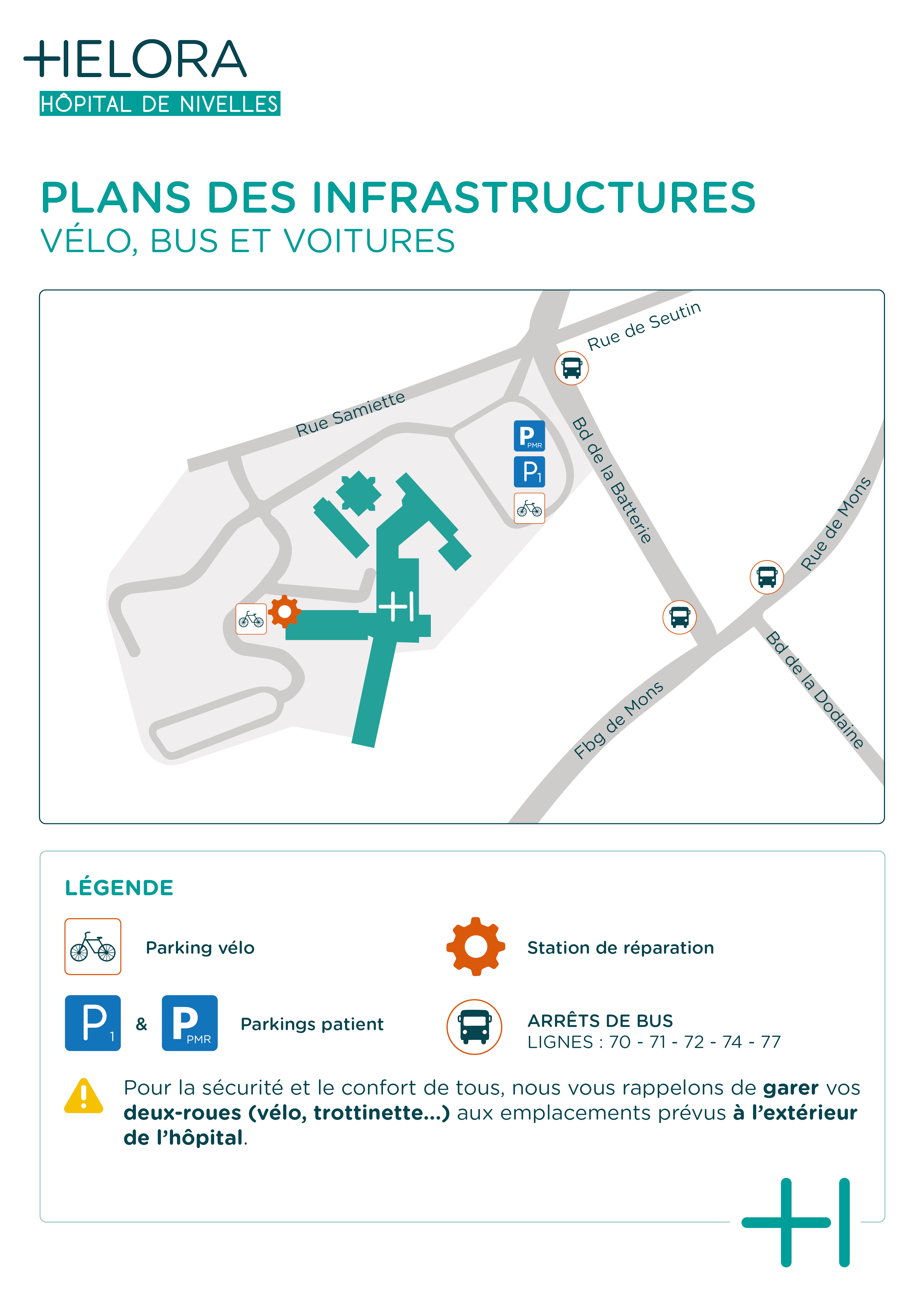 La gare de Nivelles se situe à 1,5 km de l’hôpital. La ligne TEC 66 au départ de la gare vous conduira à l’hôpital (+/- 10 min). Si vous désirez plus d’informations, rendez-vous sur: www.belgiantrain.be .