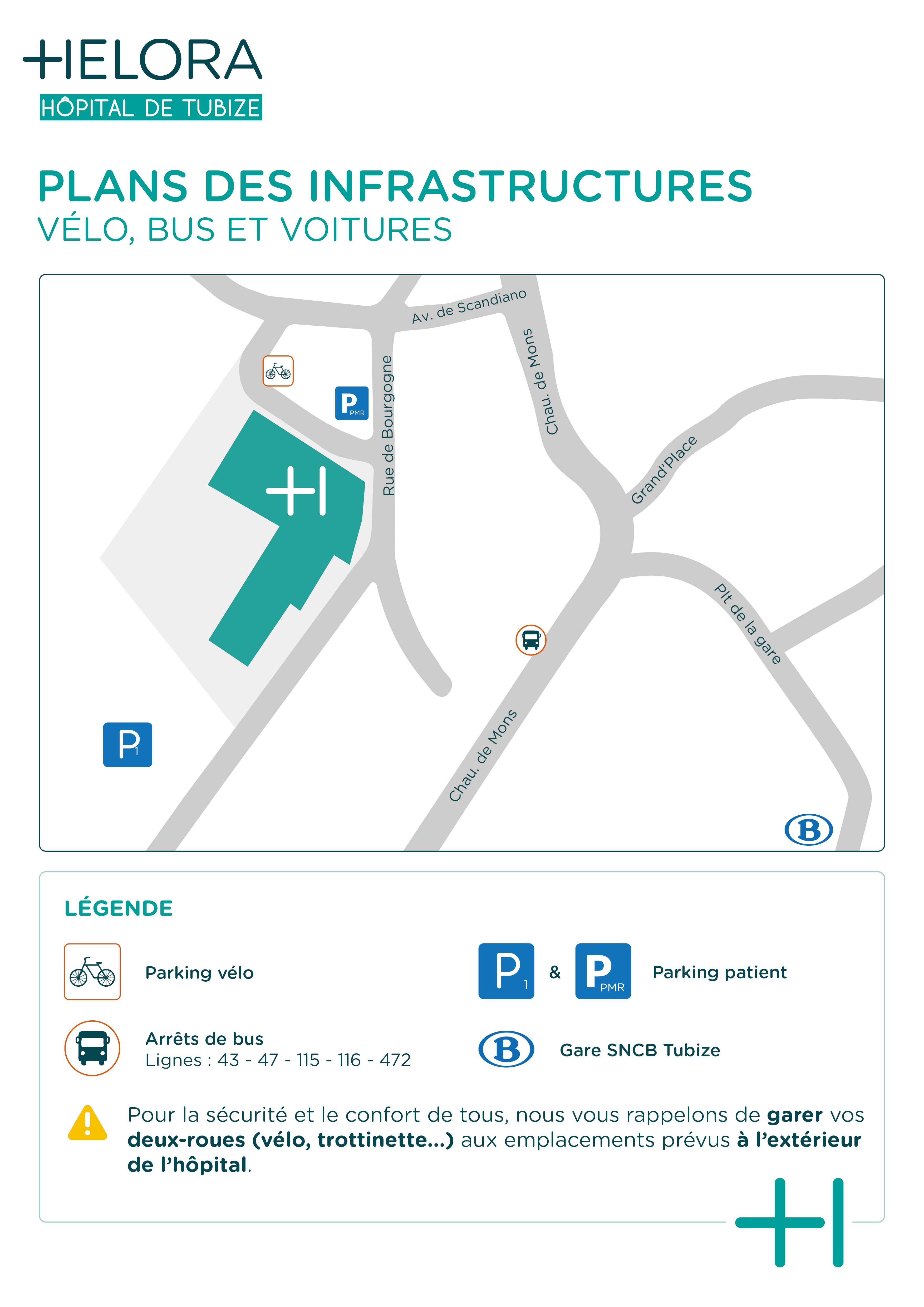 La gare de Tubize se situe à 500m de l’hôpital. Si vous désirez plus d’informations, rendez-vous sur: www.belgiantrain.be.