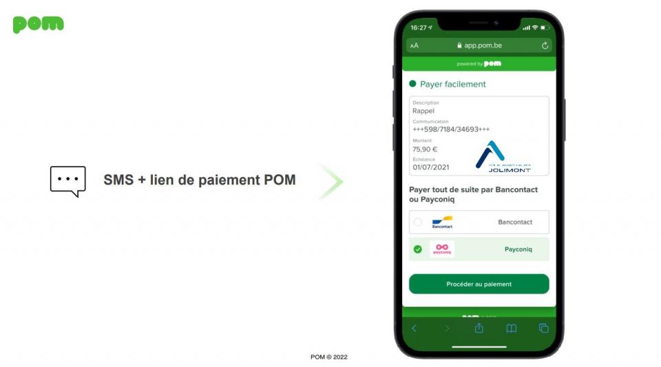 Ce lien de paiement est tout à fait sécurisé. Le paiement se fait entièrement avec votre portable grâce à l’intégration de POM avec l’application PAYCONIQ By Bancontact.